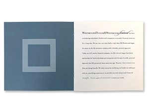 Italian artist/designer Bruno Munari states, "The square is one of the most basic shapes on earth, supporting structures both synthetic and natural." He further states the square represents stability, enclosure, a house, a village. Through the use of visual storytelling implementing the square, WDW branding builds a financial brand that is stable, reliable and powerfully connects to their base. CORPORATE BRANDING Brand Strategy, Brand Design
